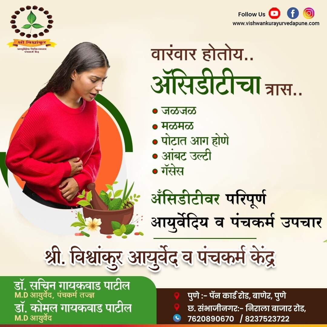 Ayurvedic treatment for Acidity It is a common condition in individuals where there is excess production of acids by the stomach. Acidity is mostly caused due to faulty food habbits and unhealthy lifestyle. Symptoms include Indigestion, gases, constipation, loss of appetite, Burning sensation in chest, Regurgitation of acid in throat causing sore throat, Nausea, vomiting, Bloating sensation, Sour taste in mouth, stomatitis, weakness, anxiety, stress, irritable bowel syndrome. Complications of acidity includes Stomach ulcers, Hiatus hernia, Hypertension, palpitations, Esoghagial cancers, diabetes, heart disease, anxiety, depression. Ayurvedic treatment and panchakarma therapies plays a very significant role in the treatment of hyperacidity and its complications. To get complete cure from hyperacidity, visit Vishwankur Ayurveda and Panchakarma centre, located in Baner, Pune. It is the best ayurvedic clinic in Baner Pune, best ayurvedic clinic near me, best ayurvedic doctor near me.