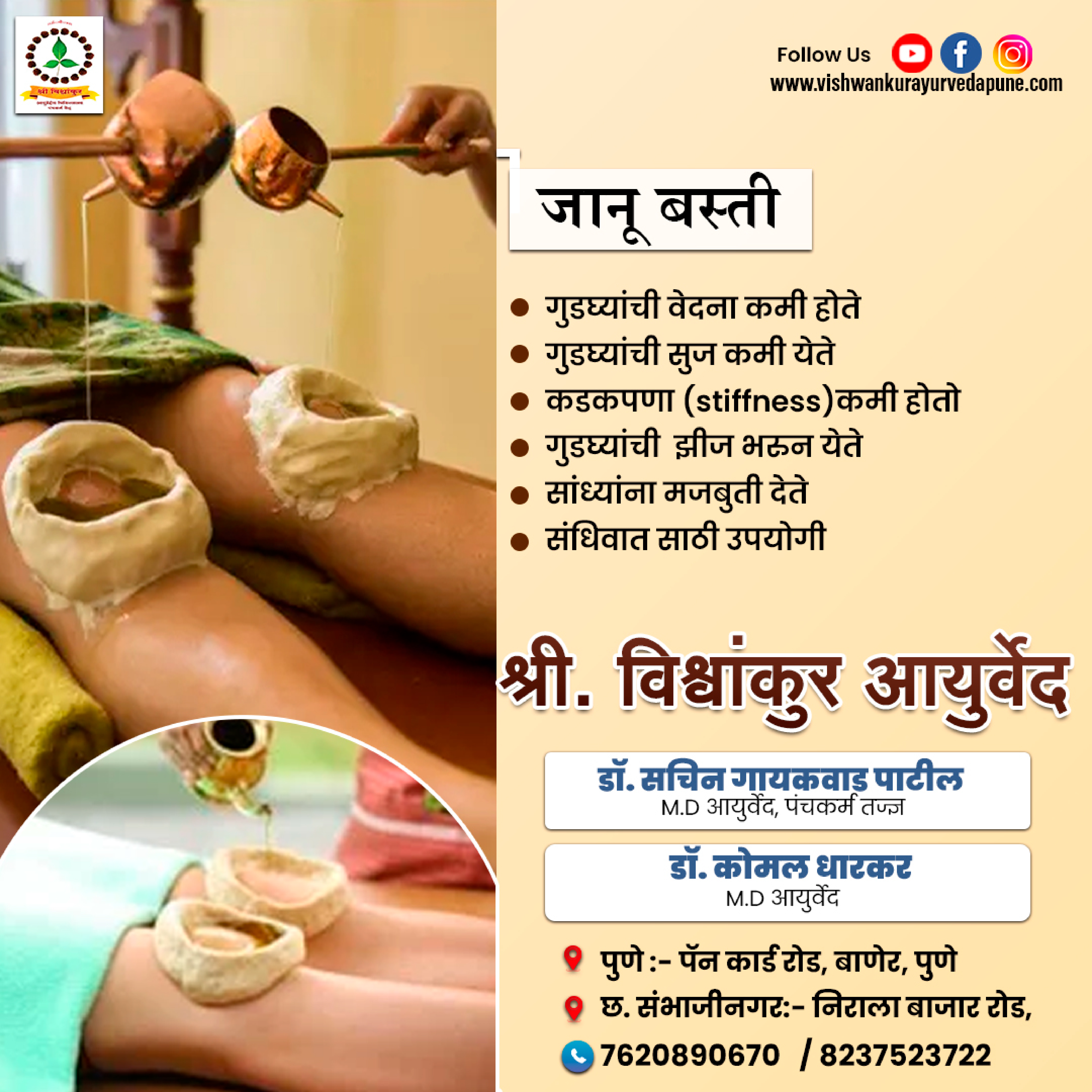 JANU BASTI PANCHAKARM Instant pain relief therapy for knee joint pain. Medicated oils are poured and retained for some time over the affected knee joint by making a column of dough. This helps to balance or nullify the effects of vitiated vata dosha which cause dryness, pain and inflammation of joints. BENIFITS * Relieves joint pain * Decrease inflammation * Decrease stiffness * Provides oleation to joint * Provides strength to joints * Reduce Arthritis * Reduce Osteoporosis * Reduce Gout pain * Reduce degenerative changes If you are looking for ayurvedic treatment for joint pain, consult our ayurveda expert doctor Dr Sachin Gaikwad Patil MD Ayu and Dr komal Gaikwad Patil MD Ayu at Vishwankur Ayurveda And Panchakarm Clinic, located at Pan Card club Road, Baner, Pune.