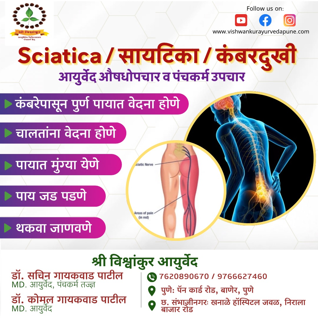 Sciatica: Causes and Symptoms Sciatica is a condition that affects millions of people worldwide, causing pain and discomfort along the sciatic nerve, which extends from the lower back down to each leg. Understanding its causes and symptoms is crucial for managing and treating this condition effectively. Causes of Sciatica: 1) Herniated Disc: One of the most common cause. When the soft inner material of a disc protrudes and presses against the nerve roots, it can result in sciatic nerve pain. 2) Spinal Stenosis: in this, the spinal canal narrows, putting pressure on the nerves, including the sciatic nerve. 3) Degenerative Disc : As people age, the discs in their spine may lose water content and elasticity, leading to degeneration and potential nerve compression. 4) Spondylolisthesis: When a vertebra slips forward over the vertebra below it, it can compress the nerves, including the sciatic nerve. 5) Piriformis Syndrome: The piriformis muscle, located in the buttocks, can sometimes irritate or compress the sciatic nerve, leading to pain. Symptoms of Sciatica: 1) Pain: sharp, shooting pain that radiates from the lower back or buttock down the back of one leg. The pain can vary from mild to severe and may worsen with prolonged sitting or movements. 2) Numbness and Tingling: People with sciatica may experience numbness, tingling, or a pins-and-needles sensation in the affected leg or foot. 3) Weakness: Sciatica can also cause weakness in the affected leg, making it difficult to move or bear weight. 4) Difficulty Standing: Some individuals may find it challenging to stand up straight or walk without experiencing increased pain or discomfort. Treatment and Management: Ayrvedic Medications: help in relieving inflammation and thereby reduce numbness , tingling and pain. Panchakarma therapy : Procedures like kati basti, basti, agnikarma , viddhakarma help to decrease nerve compression and relieve pain by decreasing the elevated vata dosha and strenghens the adjacent muscles and other structures. Sciatica can significantly impact a person's quality of life, but with proper understanding of its causes and symptoms, along with appropriate treatment and management strategies, individuals can find relief and regain function. If you experience persistent or severe sciatic nerve pain, Do consult best Ayurvedic Doctor Dr Sachin Gaikwad Patil MD Ayu Pune , for an accurate diagnosis and personalized treatment plan