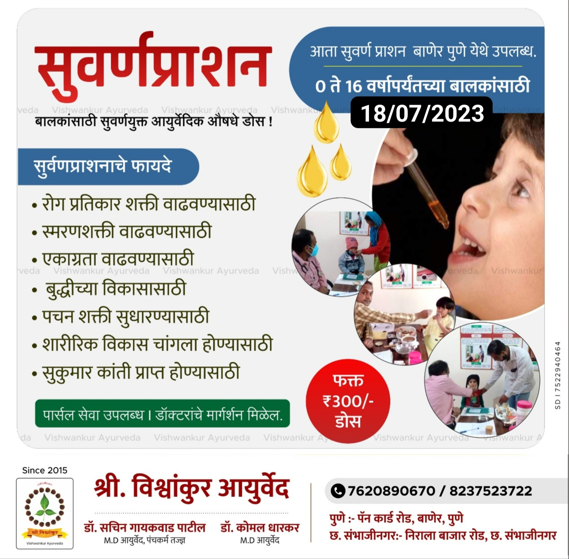 💠Swarnaprashan: An Immunomodulator and Memory Booster💠 Swarnaprashan is a traditional Ayurvedic practice that involves administering gold (swarna bhasma) along with medicated ghee, honey, and herbal medicines. It is known for its numerous benefits, including: ➡️ Improved Intellect and Memory ➡️ Enhanced Digestion ➡️ Improved Skin Complexion ➡️ Prevention of Common Cold, Cough, Fever, and more ➡️ Boosted Immunity and Overall Growth ➡️ Increased Longevity Swarnaprashan is suitable for children from newborns to 16 years of age. It is typically administered on the auspicious day of Pushya Nakshatra every month for a minimum duration of one year. If you are interested in undergoing Swarnaprashan or seeking further information, you can visit Vishwankur Ayurveda and Panchakarma Clinic located on Pan Card Club Road, Baner, Pune. Dr. Sachin Gaikwad Patil, MD Ayu, is the experienced practitioner who can provide you with detailed information and guide you through the treatment process. Swarnaprashan is known to be an effective immunomodulator and memory booster. Experience its benefits by consulting with Dr. Sachin Gaikwad Patil at Vishwankur Ayurveda and Panchakarma Clinic.