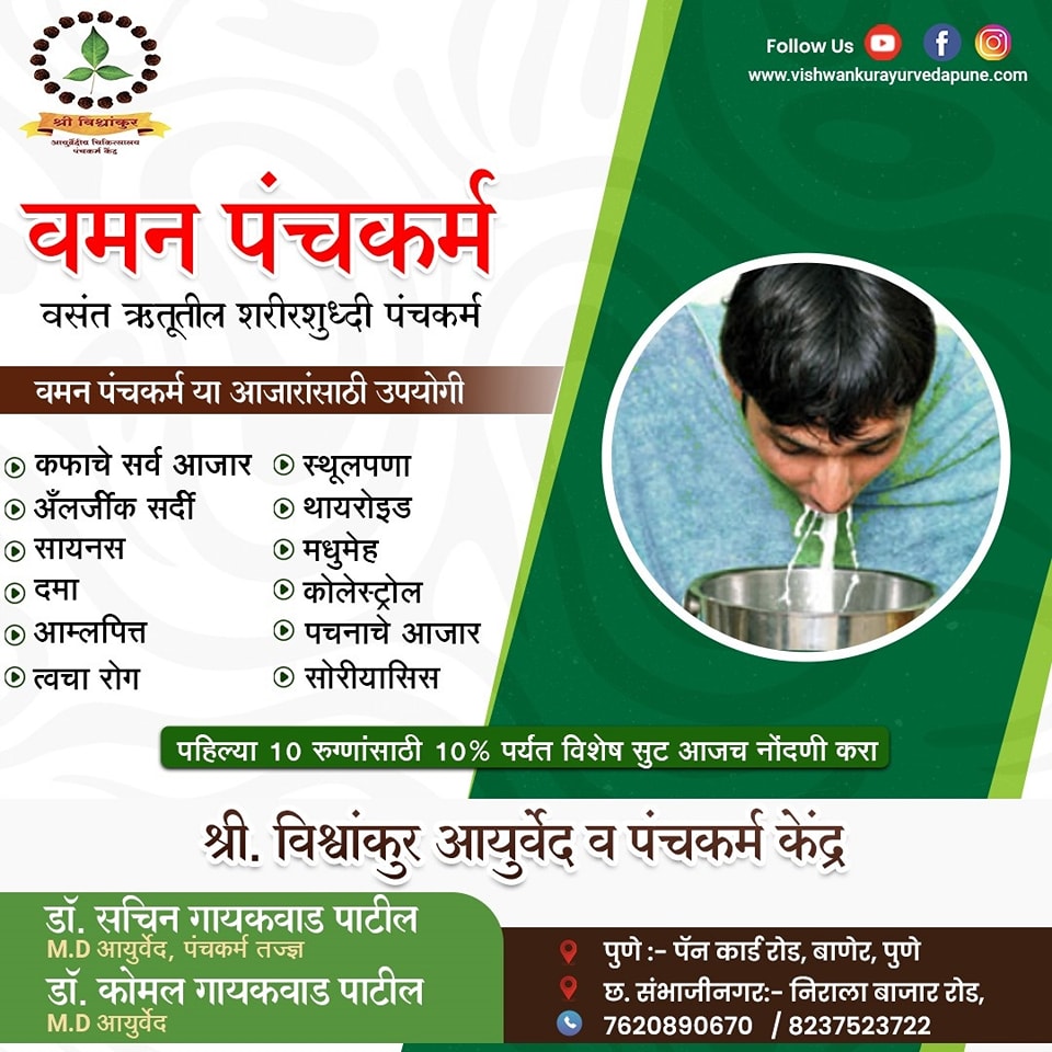 Vaman Panchakarma in Baner, Pune – Ayurvedic Detox for a Healthier You! Looking for the best Ayurvedic clinic in Baner or the best Ayurvedic clinic in Pune? Experience the healing benefits of Vaman Panchakarma at Vishwankur Ayurveda and Panchakarma Clinic, led by Dr. Sachin Gaikwad (MD Ayu) & Dr. Komal Gaikwad (MD Ayu) – your trusted Ayurvedic experts. Vaman Panchakarma is a powerful Ayurvedic detox therapy that eliminates toxins through controlled emesis (vomiting), balancing Kapha dosha and treating conditions like respiratory issues, obesity, allergies, and skin disorders. Key Benefits of Vaman Panchakarma: Detoxifies the body naturally Improves digestion & metabolism Enhances respiratory health Promotes weight loss Clears skin & purifies blood If you’re searching for the best Ayurvedic clinic near me or the best Ayurvedic doctor near me, visit Vishwankur Ayurveda and Panchakarma Clinic in Baner, Pune for expert care and holistic healing by Dr. Sachin Gaikwad (MD Ayu) & Dr. Komal Gaikwad (MD Ayu). Book your consultation today! #BestAyurvedicClinicInBaner #BestAyurvedicClinicInPune #BestAyurvedicClinicNearMe #BestAyurvedicDoctorNearMe #VamanPanchakarmaPune #AyurvedicDetoxBaner #PanchakarmaTherapyPune #AyurvedaBaner #NaturalHealingPune