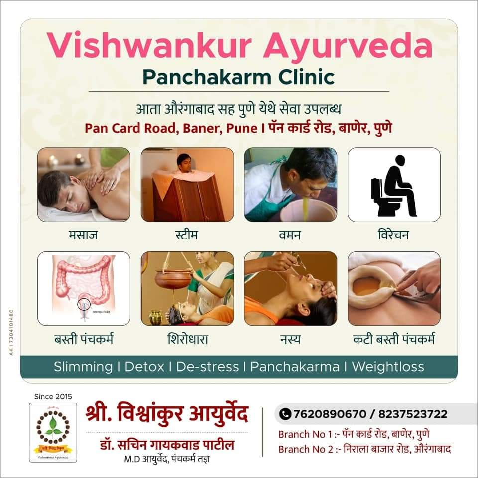Welcome to Vishwankur Ayurveda And Panchakarm Clinic, your one stop destination for complete Ayurvedic treatment in Pune. Led by Dr. Sachin Gaikwad Patil (MD Ayu)and Dr. Komal Gaikwad Patil (MD Ayu) here we treat patients with classical Ayurvedic methods along with modern diagnostic tools and techniques. Conveniently situated near Baner Hills, Pan Card Road, our clinic provides a variety of traditional Ayurvedic therapies from classical Ayurvedic treatment to various Panchakarma procedures like vaman, virechan, shirodhara, nasya, raktamokshan etc we've got everything covered under one roof. We have expertise in Panchakarma, detox and rejuvenation therapies, garbha sanskar, Nadi pariksha, Infertility, vata vikaras, stress management and weight loss. So, Seeking "Panchakarma near me"? Look no further! Our best Ayurvedic doctor in Pune, Dr. Sachin and Dr. Komal offer personalized care, addressing your health goals. If u are wishing for Ayurvedic treatment choose and trust Vishwankur Ayurveda And Panchakarm Clinic. Contact us to start your journey to a healthier life today.