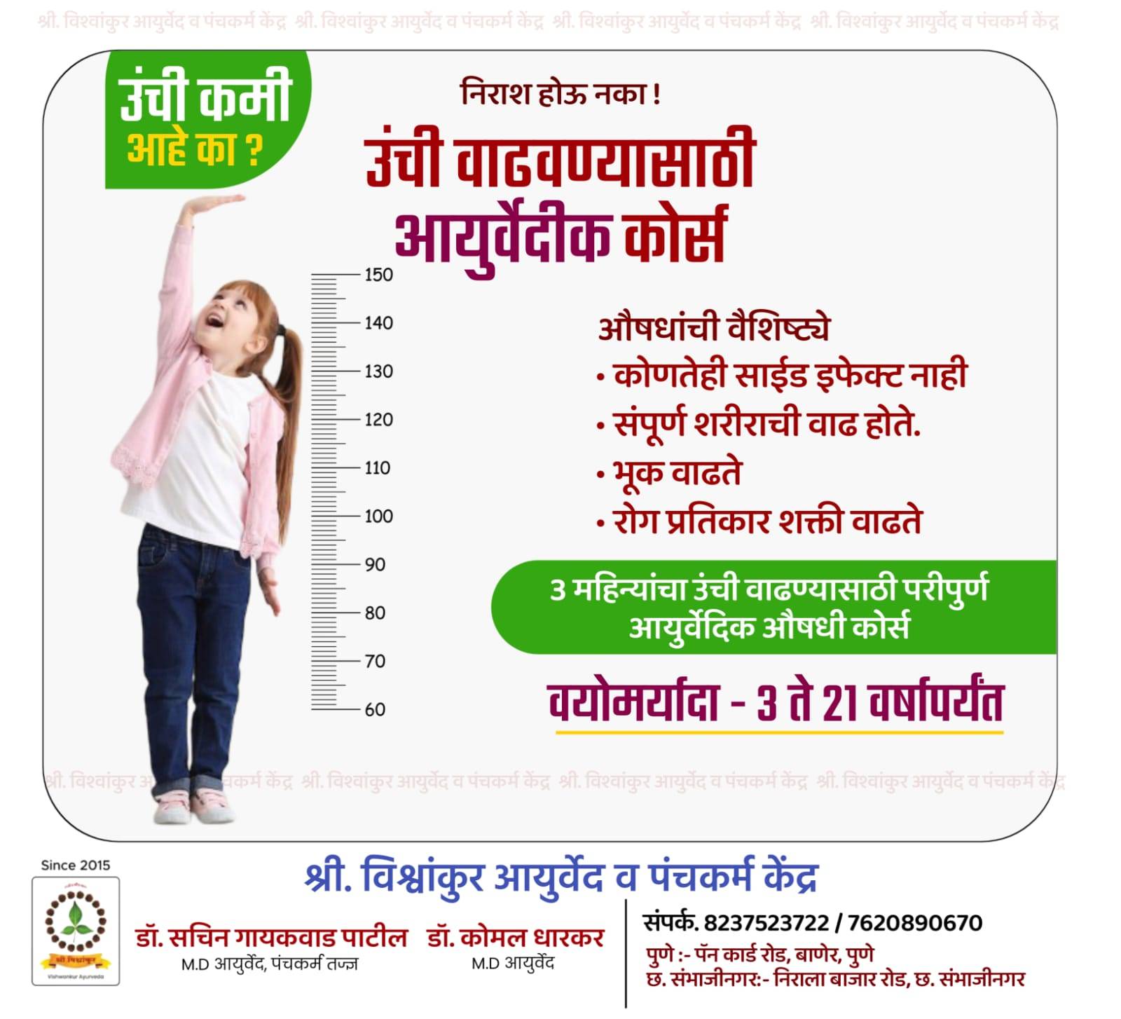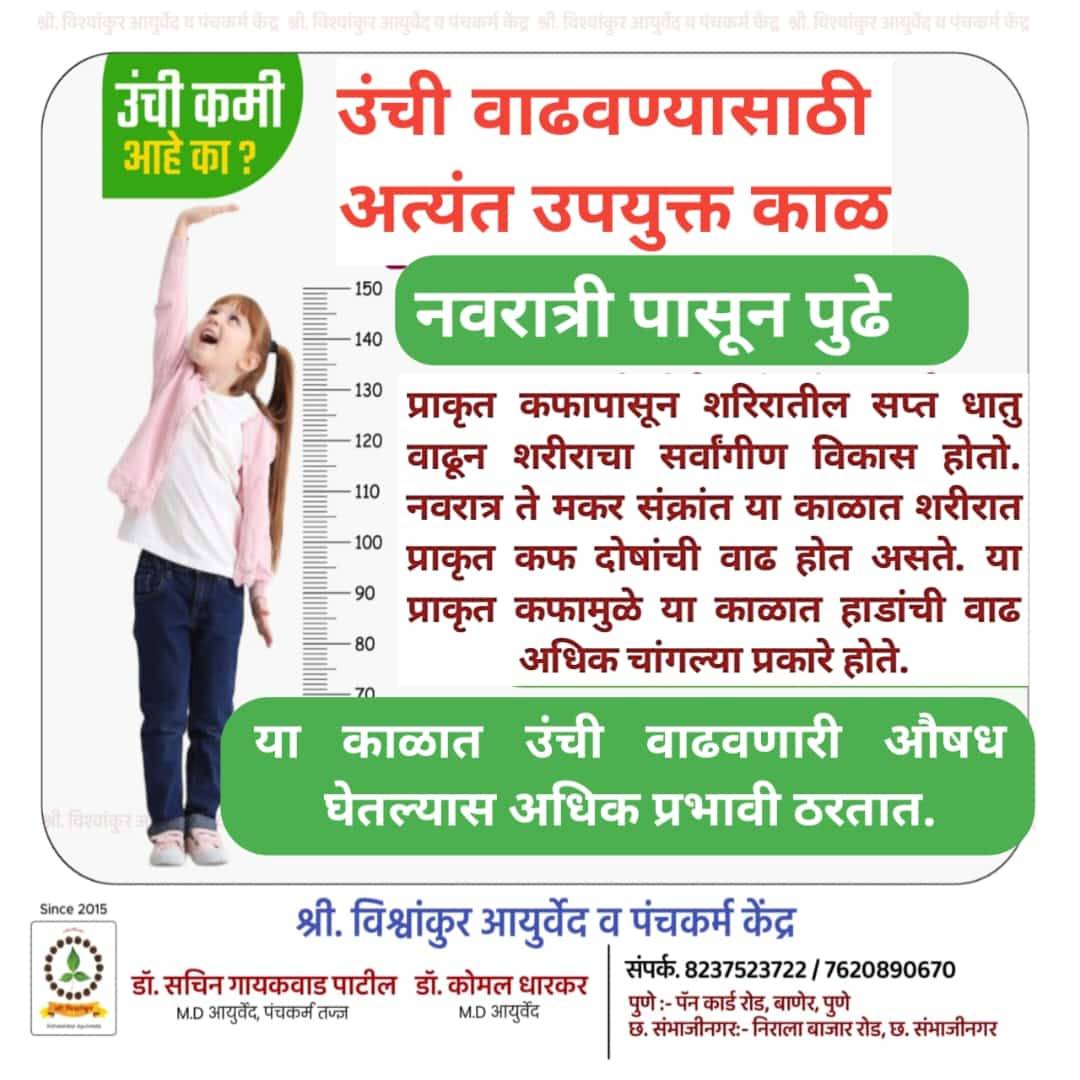 Ayurvedic treatment for height Increase the height of your child by by natural ayurvedic way. BENIFITS βœ… Increases the height βœ… Pure ayurveda treatment βœ… No side effects βœ… Helps in overall development βœ… Increases digestive power βœ… Increases immunity CONTACT Vishwankur Ayurveda and Panchakarma Clinic Dr Sachin Gaikwad Patil MD Ayu βœ… 7 years clinical experience βœ… Pulse diagnoses specialist βœ… Panchakarm specialist Dr Komal Dharkar MD Ayu 1️⃣ Pune:- Pancard club road Baner, Pune 2️⃣ Sambahjinagar:- Nirala Bazar Road ☎️ 8237523722 / 7620890670