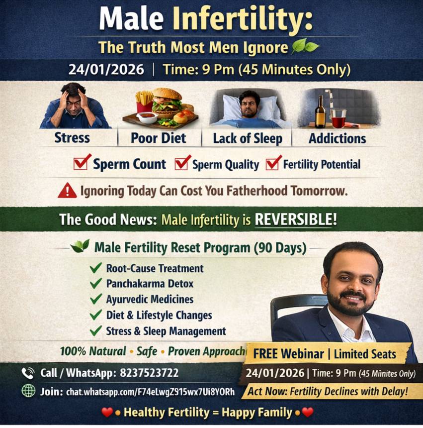 🌿 #Male_Infertility: The Truth Most Men Ignore 🌿 Stress. Poor Diet. Lack of Sleep. Addictions. These silent factors slowly reduce: ❌ #Sperm_Count ❌ #Sperm_Quality ❌ #Fertility_Potential ⚠️ Ignoring this today can cost you #fatherhood tomorrow ✅ The Good News Male infertility is REVERSIBLE — if treated correctly & on time. 🔄 Male Fertility Reset Program (90 Days) ✔ Root-cause based treatment ✔ Detoxification with Panchakarma ✔ Ayurvedic medicines ✔ Diet & lifestyle correction ✔ Stress & sleep management 🌱 100% Natural | Safe | Proven Approach 👨⚕️ Expert Guidance Dr. Sachin Gaikwad (MD Ayurveda) Vishwankur Ayurveda & Panchakarma Center Helping men restore fertility, confidence & vitality for years. 🎯 FREE Webinar | Limited Seats Take action today — Fertility declines with delay, not with age alone. 📞 Call / WhatsApp: 8237523722 🌐 Join Webinar: [https://chat.whatsapp.com/F7AeLwgZSY15wx7Ui8YORh] ✨ Healthy #Fertility = Happy Family ✨ #infertility #infertilitytreatment #maleinfertility #fertility #pcod #Ayurveda #ayurvedictreatment #pune #Drsachingaikwad #vishwankurayurveda #bestayurvedicdoctorinbanerpune #bestayurvedicclinicinbanerpune